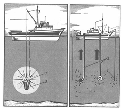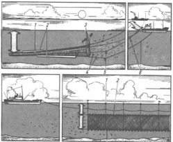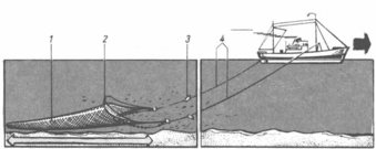 Раскрытие выброшенных за борт тралов происходит во время буксировки. Если донный трал буксируется судном, то раскрытие происходит в горизонтальном направлении за счет приделанных к ваерам траловых досок, представляющих собой плоские деревянные доски прямоугольной или овальной формы длиной 1 — 3 м и шириной 0,5—2 м в зависимости от размера сети. Эти траловые доски расположены под углом от 30 до 40° относительно направления буксировки; под влиянием гидродинамических сил они растягивают створки сети. Раскрытие в вертикальном направлении осуществляется с помощью кухтылей, размещенных в верхней подборе (верхняя сторона устья сети), и соответствующих грузов, находящихся на нижней подборе (грунтроп). У донных тралов, буксируемых двумя судами, раскрытие происходит за счет тяги судов, кухтылей и грузов, расположенных соответственно в верхней и нижней подборах сети.