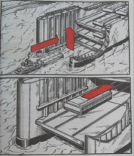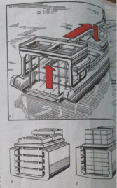 При разгрузке лихтеры поднимают из трюма с помощью козлового крана перемещают к корме и там спускают на воду. Погрузка производится в обратном порядке.