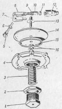 1-сідло пружини; 2 - контргайка; 3 - пружина; 4-кришка; 5-вісь важеля; 6-прокладка; 7-важіль; 8 - серга; 9 - контргайка; 10-клапан; 11 - вставка клапана; 12 - сідло клапана; 13 - болт; 14-діафрагма; 15-диск; 16-гайка і контргайка