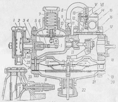 І - порожнина першої ступіні; ІІ - порожнина другої ступіні; ІІІ - порожнина розвантажувального пристрою; ІV- порожнина дозуючо-економайзерного пристрою пристрою; V-вакуумна порожнина економайзера; VІ - порожнина економайзера; 1- каркас фільтруючого елемента; 2 - пробка фільтра; 3-сідло клапана високого тиску; 4 - діафрагма клапана першої ступіні в зборі; 5-клапан; 6-тяга; 7 - пружина клапана першої ступіні; 8 - трубка розвантажувального пристрою; 9-клапан другої ступіні; 10 - важіль клапана першої ступіні; 11 -і дозуюче отвір економічного регулювання; 12-клапан економайзера; 13-пружина діафрагми; 14 - діафрагма економайзера в зборі; 15-вихідний патрубок редуктора; 16- потужнісний регулювання; 17- регулювальний гвинт зі штовхальником у зборі; 18 - важіль клапана другої ступіні; ІV-діафрагма розвантажувального пристрою; 20 - пружина розвантажувального пристрою; 21- діафрагма другої ступіні; 22-пружина клапана другої ступіні; 23-штуцер трубки розвантажувальної пристрою; 24-корпус фільтра; 25-ущільнювальна прокладка; 26-фільтрувальний елемент