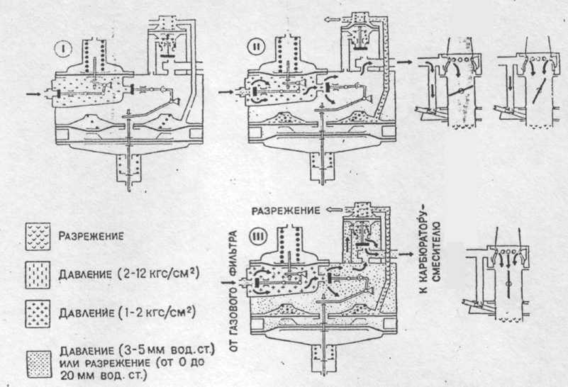 При неодруженому ході двигуна, коли витрата газу дорівнює приблизно 3 м3/год, тиск у першій ступіні повинне бути в залежності від тиску в балоні від 100 до 200 КПа (від 1 до 2 кгс/див2). Тиск у порожнині ІІ редуктора повинне бути дорівнює 3-5 мм вод. ст.