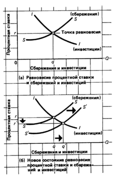 Сбережения, инвестиции и норма процента. Но экономисты-классики утверждают, что на самом деле сбережения не приводят к недостаточности спроса, ибо каждый сбереженный доллар будет инвестирован предпринимателями. Инвестирование якобы и происходит, чтобы компенсировать любую недостаточность потребительских расходов; инвестиции заполняют любой "пробел" в потреблении, вызванный сбережением. В конце концов, фирмы не намерены продавать всю свою продукцию потребителям, а склонны производить значительную долю продукции в виде средств производства для реализации друг другу. Инвестиционные расходы предпринимателей являются дополнением или добавлением к потоку доходы – расходы, что может заполнить любой "пробел" в потреблении, вызванный сбережением. Итак, если предприниматели намереваются инвестировать столько же, сколько домохозяйства рассчитывают сберечь, то закон Сэя будет действовать и уровень производства и занятости останутся постоянными. Сможет или нет экономика достичь и сохранить уровень расходов, необходимый для обеспечения производства продукции и дохода при полной занятости, будет зависеть от того, намерены ли предприниматели произвести достаточное инвестирование, чтобы компенсировать сбережения домохозяйств.