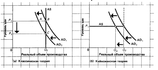 Последнее замечание. Если уменьшение предложения денег и соответственно совокупного спрос: и произойдет, то экономика, как показано на рисунке 5-1a, не будет подвержена безработице. Конечно, вследствие падения совокупного спроса с AD1 до AD2 незамедлительно появится избыток предложения продукции в том смысле, что совокупный объем товаров и услуг превысит совокупные расходы на величину АВ. Но если принять во внимание предположение об эластичности цен на продукцию и ресурсы в сторону понижения, этот избыток предложения продукции вызовет падение цен на продукцию вместе с понижением заработной платы рабочих и цен на другие вводимые ресурсы. В результате этого уровень цен будет быстро понижаться с Р1 до Р2, пока не наступит равновесие между предложением продукции и спросом на нее, на этот раз в точке С. Поскольку уровень цен понизился с Р1 до Р2, реальный объем производства останется на уровне, соответствующем полной занятости.