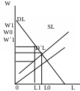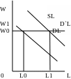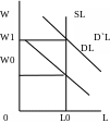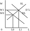 е захотят нести убытки и снизят спрос на труд. При этом кривая DL переместится в положение D`L, а уровни ставки заработной платы и занятости установятся в точках W1 и L1 соответственно. Что означает снижение и зарплаты, и числа нанятых работников.