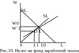 Кроме граждан, налоги обязаны платить и предприятия. Например, все работодатели обязаны производить отчисления в фонды социального страхования соцобеспечения, в фонд занятости и в пенсионный фонд — это так называемый налог на фонд зарплаты. Рассмотрим изменения, происходящие на рынке труда, при введении этих налогов. В отсутствие налогов равновесные уровни занятости и зарплаты устанавливаются соответственно в точках L0 и W0. Введение налога фактически означает, что каждый работник будет обходиться нанимателю дороже, так как кроме зарплаты, фирма будет вынуждена выплачивать за него определенные отчисления. Налог повышает цену труда для нанимателей или снижает предельный продукт труда в стоимостном выражении. Так как спрос на труд определяется его предельным продуктом, то ясно, что наниматели н