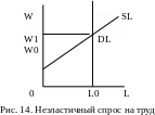 руд падает (DL=>D`L). Устанавливается новая равновесная ставка заработной платы в точке W`1, и новый уровень занятости в точке L1. Оказывается, что в результате введения налога падает и зарплата, и занятость. Надо сказать, что конечные последствия введения налога сильно зависят от эластичности кривых спроса и предложения. При абсолютно эластичном предложении произойдет резкое падение уровня занятости, при неизменной ставке заработной платы. Наоборот, при абсолютно неэластичном предложении упадет ставка зарплаты, а не уровень занятости.
