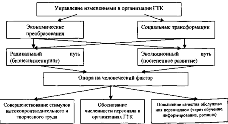 Таким образом, в настоящее время в России начинает складываться сеть организаций, предоставляющих туристские услуги, которые работают в условиях жесткой конкурентной борьбы за клиента. Особенно острыми проблемами у турфирм и гостиниц являются низкий профессионализм персонала и отсутствие законодательно проработанной государственной политики поддержки индустрии туризма. Выявленное в результате анализа разнообразие в целях и крупномасштабные изменения в организациях ГТК определяют современный подход к управлению ими. В основе эффективного управления организацией ГТК лежит управление изменениями, направленное на экономическое преобразование и социальные трансформации, в основе которых изменения в управлении человеческим фактором (рис.1).