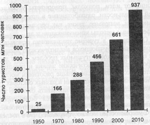 Прогнозы, составленные на начало XXI в. Всемирной туристской организацией, являются хорошим источником для изучения мирового туристского сектора. В частности, на рис. 7.1 показано, что международные туристские прибытия во всем мире увеличатся до 661 млн. человек в 2000 г., до 937 млн. - в 2010 г. За 1990-2010 гг. число туристов в мире увеличится вдвое. Ежегодные темпы роста мирового туризма в 1990-2000 гг. составят 3,8%, а в 2000-2010 гг. - 3,5%.