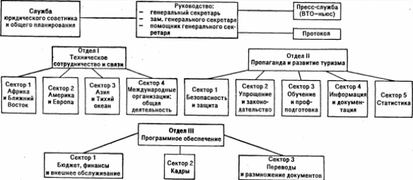 Секретариат ВТО состоит из штата сотрудников (около 90 представителей 30 стран), его возглавляет генеральный секретарь ВТО. (Схема организационной структуры секретариата ВТО приводится на рис. 1)