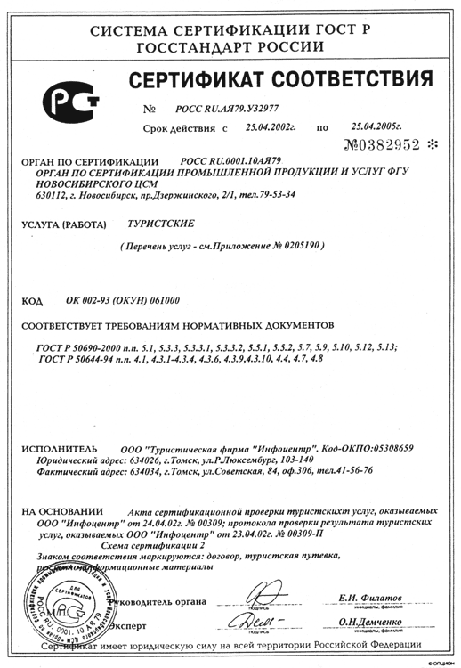 на основании заявки № 25 Ф от 18.04.2000, решения ОС по заявке от 25.04.2000, программы проверки и договора на выполнения работ по сертификации провела проверку соответствия туристических услуг обязательным требованиям нормативных документов ГОСТ Р 50644-94, ГОСТ Р50690 - 2000, ГОСТ Р 50681 - 94 путем экспертизы документации и проверки соответствия туристических услуг установленным требованиям.