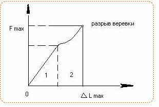 оэффициент пропорциональности α называют коэффициент жесткости веревки. При некоторых усилиях зависимость силы от деформации становится нелинейной (область 2). Наконец при увеличении силы наступает такое значение Fmax (которому соответствует Lmax, когда наступает разрыв веревки.