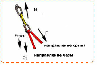 На рисунке изображена верхняя точка страховки, на которой произошло задержание сорвавшегося. Кинетическая энергия сорвавшегося альпиниста поглощается упругим растяжением веревки. При этом на сорвавшегося действует сила упругости F, эта же сила воздействует на карабин верхней точки страховки в направлении срыва.