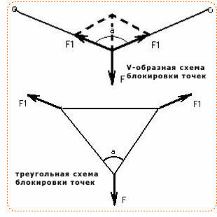 | Страховка в горах Некоторые вопросы по работе с веревкой и организации страховочной базы К К На веревку действует сила F1, растягивающая ее. При этом силы F1 по разную сторону веревки равны по величине, но имеют разное направление. Векторно складываясь, она образует силу, которая равна силе F по величине и противоположна по направлению. Нетрудно определить, что F1=F/(2·cosa/2), где а — угол между веревками в точке приложения силы F. При F1=F/2, при а=180° значение силы бесконечно велико. Чем угол ближе к 180°, тем больше будет сила растяжения веревки.По этой причин при организации перил чрез различные препятствия (реки, трещины) невозможно, чтобы веревка не имела провиса, как бы ее не натягивали. Чем меньше провис, тем большая сила будет действовать на точки закрепления веревки. Это же надо иметь в виду при блокировании точек страховки — угол между ними нельзя делать, как мы увидим, больше 120°. Приведем еще формулу для варианта блокирования точек треугольной схемой. При этом, как видно из таблицы ниже, угол а не должен быть больше 60°. F1=F/(2·sin(π/-a/4)). Из таблицы видно, что при угле 120° для V-образного блокирования нагрузка на каждую точку страховки составляет 100% от приложенной силы и фактически эффект блокирования теряется (то есть две точки работают с той же надежностью, что и одна). Для треугольной схемы величина угла, при котором уже не имеет смысла блокировать точки, составляет 60°. Величина нагрузки на точки страховки в зависимости от угла блокирования точек страховки