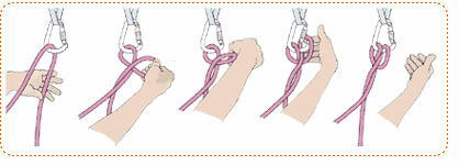 Для вщелкивания веревки в карабин рекомендуется следующий прием. Веревку вытягивают вверх (при этом ее придерживают, зажимая в зубах — это не очень удобно, да и небезопасно для зубов, но ничего лучшего не придумано). Если можно не зажимать в зубах — лучше не зажимать. Потом веревку перехватывают рукой и приемом, указанным на рисунке, вщелкивают ее в карабин.