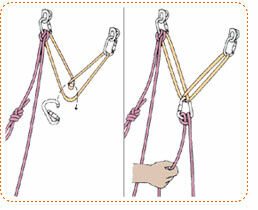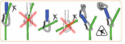 Другой возможный вариант — соединять конец веревки к системе с помощью карабина (в этом случае используется только карабин с муфтой). При этом надо знать, что если при срыве рывок придется поперек карабина — на муфту, в этом случае карабин разрушается при небольшой нагрузке (400 кг по нормам UIAA). По этой причине для первого в связке рекомендуется применять ввязывание в
