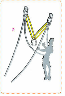 2 полуверевки — вщелкивают в карабины поочередно, распределяя одну веревку справа по ходу движения, другую — слева. Не допускается перехлест веревок. При использовании двух полуверевок уменьшается трение в карабинах и о рельеф, что помогает при работе на сложных маршрутах. Они более защищены от перебивания, хотя каждая веревка менее надежна сама по себе и быстрее выходит из строя из-за повреждений оплетки. Удобна при спуске дюльфером — не нужно нести еще одну веревку. Приемы страховки более сложные, чем для одинарной веревки. При нижней страховке надо следить, чтобы не было провисания веревки в каждой из ветвей. При вщелкивании веревки в карабин промежуточной точки первый в связке выбирает одну из веревок. Страхующий должен оперативно выдать ее и в случае необходимости — срочно выбрать в первоначальное положение. При этом расположение другой ветви веревки не меняется.