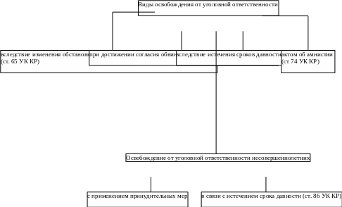 Итак, в систему видов освобождения от уголовной ответственности следует включить освобождение вследствие изменения обстановки или утраты лицом общественной опасности (ст. 65 УК Кыргызской Республики); освобождение при достижении согласия с потерпевшим (ст. 66 УК Кыргызской Республики); освобождение от уголовной ответственности за истечением сроков давности (ст. 67 УК Кыргызской Республики); освобождение несовершеннолетнего от ответственности с применением принудительных мер воспитательного воздействия (ст. 86 УК Кыргызской Республики); освобождение от уголовной ответственности в связи с истечением сроков давности (ст. 88 УК Кыргызской Республики); освобождение от уголовной ответственности актом об амнистии (ст. 74 УК Кыргызской Республики), (см. схему № 1).