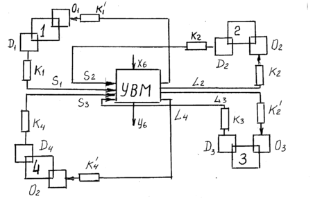 Для управления современными объектами используется большое количество элементов (подсистем). Совокупность элементов, участвующих в управлении называется управляющим комплексом. Типичный управляющий комплекс состоит из элементов следующих типов (рис. 2): D – датчики осведомительной информации; S – средства передачи информации; L- управляющие элементы; O – органы управления;- k, k1 - различные преобразующие и переходные устройства