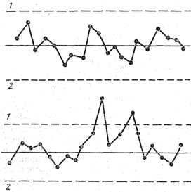 При осуществлении контроля характеристик с помощью контрольных карт проверяют, попадают ли все точки графика в диапазон между двумя линиями, представляющими собой контрольные границы. Этот диапазон характеризует контрольные нормативы, ,в пределах которых разброс показателей качества считается допустимым. Такой разброс вызван случайными отклонениями (в пределах допустимых значений) показателей качества исходных материалов или деталей, а также условий производства, и называется неизбежным разбросом (рассеянием) показателей качества. Таким образом, колебание по вертикали точек графика внутри контрольного диапазона определяет неизбежный разброс показателей качества и не требует вмешательства в ход процесса.