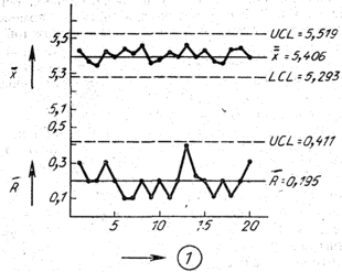 Для осуществления контроля процесса с помощью контрольных карт прежде всего из показателей качества, формируемых в результате этого процесса, выбирают наиболее важные, которые сравнительно быстро могут быть представлены в виде количественных данных. Для этих данных строят контрольную карту. Если все точки, наносимые на бланк этой контрольной карты, попадают внутрь диапазона, ограниченного контрольными границами, делается заключение о том, что процесс протекает в стабильных условиях. Таким образом, такие факторы как контрольные параметры и состояние исходных материалов должны подвергаться постоянной непосредственной проверке. Если на контрольной карте точки немного колеблются вверх-вниз относительно средней линии, не выходя за пределы контрольных границ, можно спокойно работать. Процесс можно считать стабильным, если дневные партии изделий, выпущенных за 2—3 дня подряд, почти идентичны. Когда процесс протекает стабильно и удовлетворяет всем требованиям с технологической и экономической стороны, говорят, что «процесс находится в контролируемом состоянии».