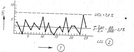 При построении p-карты вначале собирают предварительные данные так, чтобы их число можно было представить. 20-25 группами, и для каждой группы рассчитывают долю (%) дефектной продукции рпо следующей формуле:
