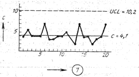 1. Значения суммарного числа дефектов С из табл. 2.14 наносят на бланк контрольной карты. В этом случае по вертикальной оси откладывают значения С,а по горизонтальной —номера выборок.
