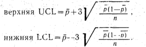 Аналогично карте (х’—R), если все точки графика оказываются внутри контрольного диапазона р-карты или С-карты, это означает, что процесс протекает в стабильных условиях; Если же одна или несколько точек выходит за контрольные границы, это означает, что в процессе произошли какие-то отклонения, грозящие выходом дефектной продукции. При этом для предотвращения повторного «выброса» необходимо быстро найти причину отклонения и принять меры по ее устранению.