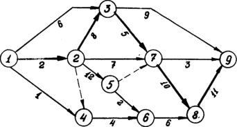 Для ручного счета события в сетевом графике нумеруются следующим образом: номер предшествующего собатия должен быть меньше номера последующего события. После нумерации событий шифр (код) работ заносится в графу 8, Причем шифр работ заносится в возрастающем порядке (выписываются все работа, "выходящие" из первого события, затем из второго и т.д.). В графу 1 таблицы заносится количество работ, предшествующих данной работе, т.е. количество работ, "входящих" в ее начальное событие. Продолжительность работ проставляется на основании исходных данных.