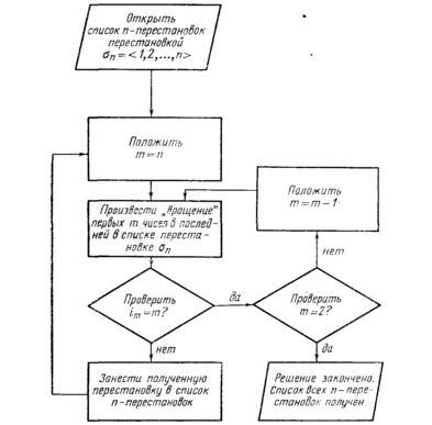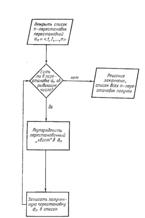 Другой алгоритм — Алгоритм-2 — получения всех n-перестановок представлен блок-схемой на рис. 8.