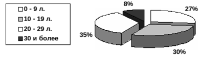 1. Время работы в данной организации. Большинство работников исследуемой организации работают в ней довольно продолжительное время. В сумме от 10 до 30 и более лет в данной организации работает 73% опрошенных. Менее 5 лет работают лишь 7 человек, то есть 19%.
