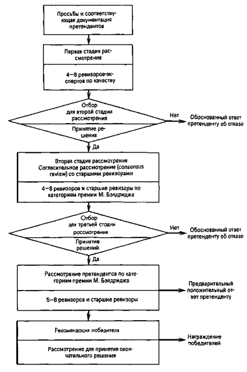 Просьба (заявление) компании, претендующей на премию М. Бэлдриджа, рассматривается группой людей из Совета ревизоров (экзаменаторов — examiners board), состоящего примерно из 150 .экспертов по качеству, представляющих промышленность, правительство и университеты. Процедура рассмотрения претендентов, считающих себя достойными получить национальную премию М. Бэлдриджа, приведена на рис.2.