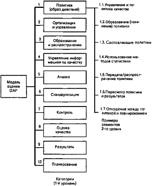 Эти ключевые моменты составляют в модели оценки соответствующих категорий 1-го уровня. Однако для более детального анализа деятельности компании, претендующей на приз Деминга, модель оценки DAP предусматривает развертывание наиболее важной с ее точки зрения категории 1-го уровня на 2-м уровне, как это показано на, рис. 1.