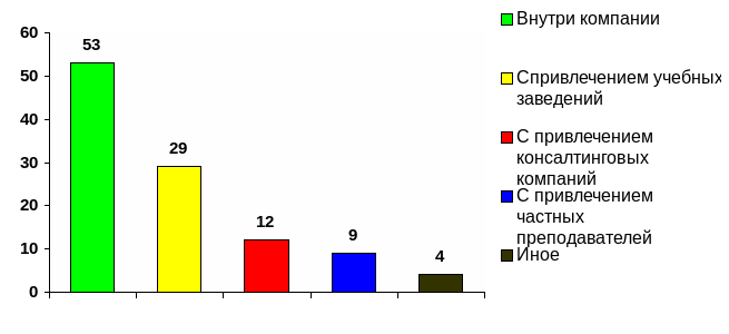 Успешность обучения во многом зависит и от того, кто его проводит. По оценкам респондентов, самые лучшие преподаватели – это практики, т.е. те, кто сами участвуют в производственном процессе. Так считают 53 респондента, обучающие персонал внутри компании. Услугами учебных заведений и консалтинговых фирм пользуются 29 и 12 компаний соответственно. Частных преподавателей приглашают 9 респондентов, а иных «учителей» - 4 компании.