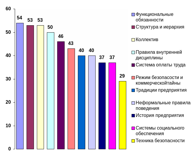 Далее требуется информация о непосредственной трудовой деятельности – функциональных обязанностях - 61 %. Затем снова «социальный» блок – система социального обеспечения – 60 %, неформальные и формальные правила поведения в коллективе – по 58 % в каждом случае. Такая информация, как режим безопасности и коммерческой тайны, техника безопасности, структура и иерархия предприятия по значимости для новичка менее важны (57, 55 и 51 %% соответственно).