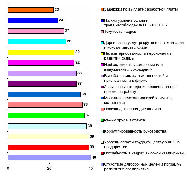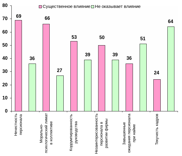Две трети компаний страдают от несбалансированности морально-психологического климата в коллективе. Чуть более половины (53) – от коррумпированности руководителей различного уровня. В данном случае респонденты имели в виду нечестность, нелояльность руководителей по отношению к компании. В 50 компаниях отмечается отчуждение сотрудников от компании и их незаинтересованность в ее развитии. Нечетко сформулированные при найме условия труда и оплаты приводят к тому, что новые сотрудники испытывают разочарование и дискомфорт, столкнувшись с действительностью (в 36 компаниях). Высокая текучесть кадров беспокоит 24 компании.