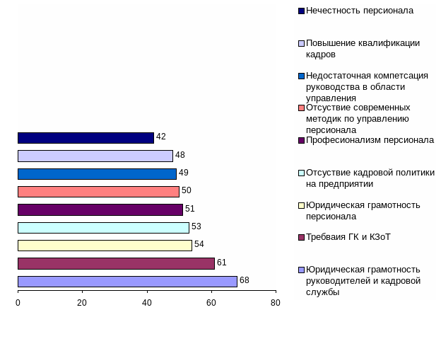 Существующий профессиональный уровень персонала вызывает тревогу в 80 % компаний, принявших участие в опросе. Серьезное значение придается юридической грамотности не только руководителей и кадровых служб (60 компаний), но и сотрудников (27 компаний). Тем более что отмечаются конфликты на этой почве в 6 и 4 случаях соответственно. Респонденты также отмечают случаи нарушений трудового законодательства, происходящие из-за недостаточной юридической компетенции руководителей и кадровых служб – в 8 компаниях, рядовых сотрудников – в 6 компаниях.