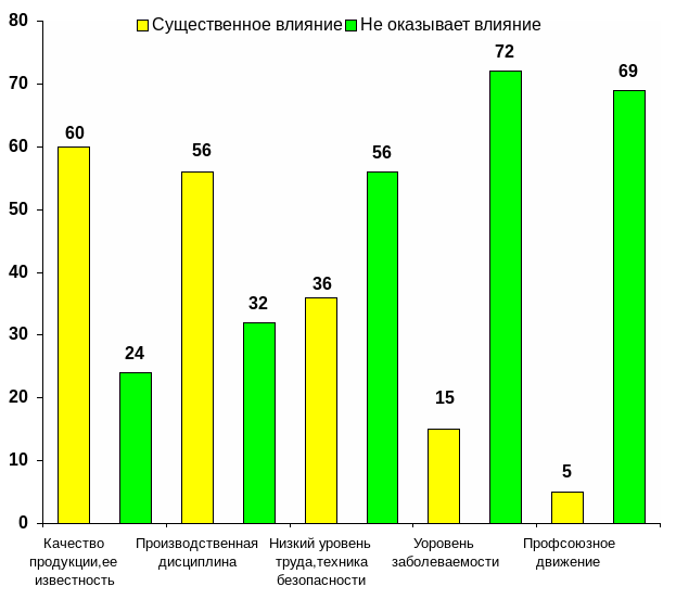 Общемировая тенденция снижения роли профсоюзного движения проявилась и в результатах данного исследования. Только 5 компаний заявили, что испытывают давление со стороны профсоюзов. Основная масса руководителей предпринимают шаги по недопущению деятельности профсоюзов не предприятиях. Но эти усилия, не подкрепленные мероприятиями по «индивидуализации» трудовых отношений выливаются в высокий уровень заболеваемости (15 компаний), низкий уровень условий труда, несоблюдение правил техники безопасности (36 компаний) и низкую производственную дисциплину (56 компаний). 60 компаний обеспокоены качеством производимой продукции, продаваемых товаров и оказываемых услуг.