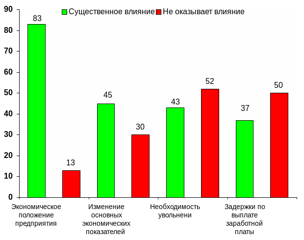Влияние (как положительное, так и отрицательное) существующего экономического положения предприятия на работу с персоналом оценивают как существенное 83 компании. Еще 45 компаний понимают, что все процессы следует рассматривать в динамике. Далеко не лучшим образом сказывается на деятельности компании и сотрудниках необходимость увольнений и задержки по выплате заработной платы (в 43 и 37 компаниях соответственно).