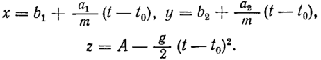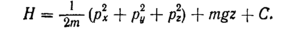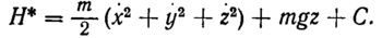 Як узагальнені координати вибираємо декартові координати: q1 = χ, q2 = у, q3 = z. Відповідні ним узагальнені імпульси наступні: p1 = рx, р2= ру, р3 = рг. Точка вільна, тому узагальнена механічна енергія Н* дорівнює повній механічній енергії Ε == Т + Π. Направляючи декартову вісь Оz по вертикалі вгору, знаходимо