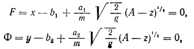 Тут рівності (i) — проміжні інтеграли, що визначають узагальнені імпульси розглянутої точки. Геометричні інтеграли (j) визначають сімейство просторових кривих — можливих траєкторій точки, що є лініями перетинання параболічних циліндрів з утворюючими, рівнобіжними осям Оу й Ох відповідно. Кінематичний інтеграл (k) дозволяє визначити кінематичні рівняння руху точки:
