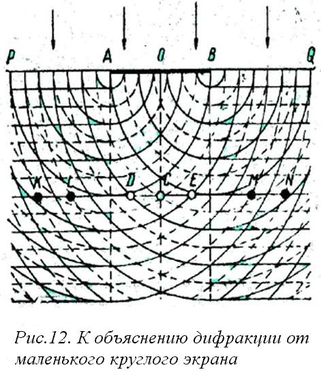 Желательно подчеркнуть, что дифракция получается и от больших экранов, но в этом случае она образуется далеко за ними и интенсивность света на больших расстояниях бывает недостаточной. Остается объяснить, как образуется явление дифракции в области геометрической тени и там, где, казалось, можно было бы ожидать равномерную освещенность.