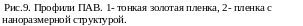 Исследование распространения ПАВ по периодической структуре проводилось на образце, который изображен на рисунке 8, периодическая структура на его поверхности была получена следующим образом. На стеклянную подложку напыляют золотую пленку толщиной порядка 50 нм. Затем, образец погружают в емкость с глицерином (рис.8), на поверхности которого плавают поллистироловые шарики диаметром 500 нм. Далее пластинку вытягивают таким образом, что на поверхности золотой пленки образуется монослой из шариков, в промежутки между которыми снова напыляется золото, причем время напыления в данной фазе изготовления образца равно времени напыления пленки, поэтому средняя высота неоднородностей также составляет 50 нм. После чего производится отжиг поллистирола и получается периодическая структура, состоящая из призмочек с вогнутыми гранями (длина грани 100 нм., расстояние между объектами порядка 500 нм.). На рисунках 9 и 10 представлены профили рэлеевских волн на поверхности стекла с тонкой золотой пленкой на которой сделана наноразмерная периодическая структура, описанная выше. Профиль 1 (рис.9) получен при возбуждении волны в точке А (рис.8) и регистрации в точке Б, т. е. акустический импульс проходит по поверхности гладкой пленки. Импульс 2 получен при возбуждении в точке А/ и регистрации в точке Б/ (импульс проходит через периодическую структуру). Профили сдвинуты относительно друг друга, это связано с замедлением волны 2.