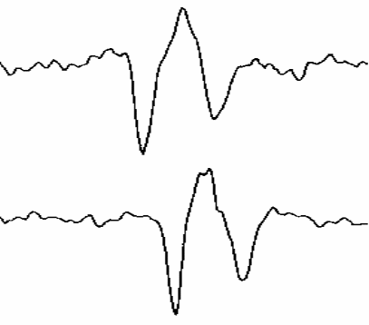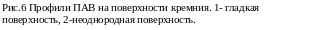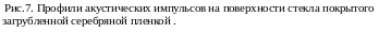 Так же проводились исследования ПАВ на поверхности стекла покрытого тонкой загрубленной серебряной пленкой толщиной примерно 50 нм., наблюдалось затухание волны, связанное с рассеянием на неоднородностях поверхности, профили импульсов 1 и 2 (рис.7) в данном случае получены для различных расстояний между точками возбуждения и регистрации (профиль 1 регистрировался на расстоянии 2 мм от точки возбуждения, профиль 2 на расстоянии 4 мм от точки возбуждения). Так же при распространении волны наблюдалось искажение ее профиля, что может быть связано с дифракцией волны на неоднородностях пленки и рассеянием в объемные волны.