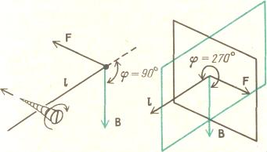 быть перпендикулярна как напряженности магнитного поля В, так и проводу I. Направление силы может быть найдено или с помощью правила правого винта для векторного произведения, или обращением к модели линий магнитного поля. Модуль силы равен F=ILBsin где — угол между линиями поля и проводом. Когда угол = 90°, сила максимальна и имеет направление, которое считается положительным в соответствии с правилом правой руки. Когда =0, действующая на провод сила равна нулю. Когда =270°, ток в проводе имеет противоположное по сравнению с первым случаем направление; сила максимальна, но теперь имеет направление, принимаемое за отрицательное.