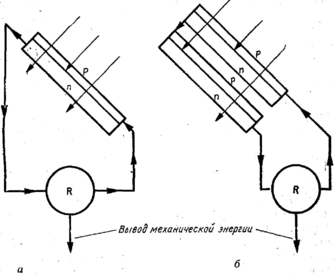 ис. 13. Типы фотоэлектрических генераторов: а—однокаскадный; б—многокаскадный.