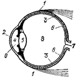 исунок 1. Схематический разрез глаза человека. 1 — белковая оболочка, 2 —роговая оболочка, 3 — сосудистая оболочка, 4 — зрачок, 5 — хрусталик, 6 — сетчатая оболочка, 7 — нерв, 8 — стекловидное тело, 9 — передняя камера