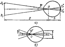 Зная положение оптического центра, можно легко построить изображение какого-либо предмета на сетчатой оболочке глаза. Изображение всегда действительное, уменьшенное и обратное (рис. 3, а). Угол φ, под которым виден предмет S1S2 из оптического центра глаза О, называется углом зрения.