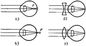 Далеко не у всех людей глаз является нормальным. Нередко задний фокус глаза в спокойном состоянии находится не на самой сетчатке (как у нормального глаза), а с той или другой стороны от нее. Если фокус глаза в спокойном состоянии лежит внутри глаза перед сетчаткой (рис. 2, а), то глаз называется близоруким. Такой глаз не может отчетливо видеть отдаленные предметы, так как напряжение мышц при аккомодации еще сильнее отдаляет фокус от сетчатки. Для исправления близорукости глаза должны быть снабжены очками с рассеивающими линзами (рис. 2, б).