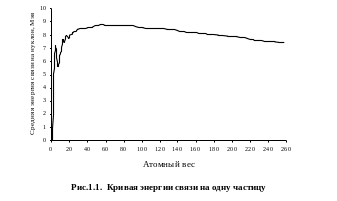 сороковые годы ХХ века благодаря работам Астона, Демпстера и других ученых с большой точностью были определены значения дефекта массы и вычислены энергии связи для ряда изотопов. На рис.1.1 эти результаты представлены в виде графика, на котором по оси абсцисс отложен атомный вес изотопов, а по оси ординат – средняя энергия связи частицы в ядре.