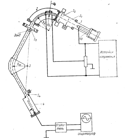 Полученные в источнике ионы ускоряются разностью потенциалов Ua=40 кв и фокусируются на входной щели S1 шириной около 13 мкм; такова же ширина щели S4, на которую проектируется изображение щели S1. Апертурная щель S2 имеет ширину около 200 мкм, щель S3, на которую электростатическим анализатором проектируется изображение щели S1, имеет ширину около 400 мкм. За щелью S3 расположен зонд, облегчающий подбор отношений Ua/Ud, т. е. ускоряющего потенциала Ua источника ионов и потенциалов анализатора Ud.